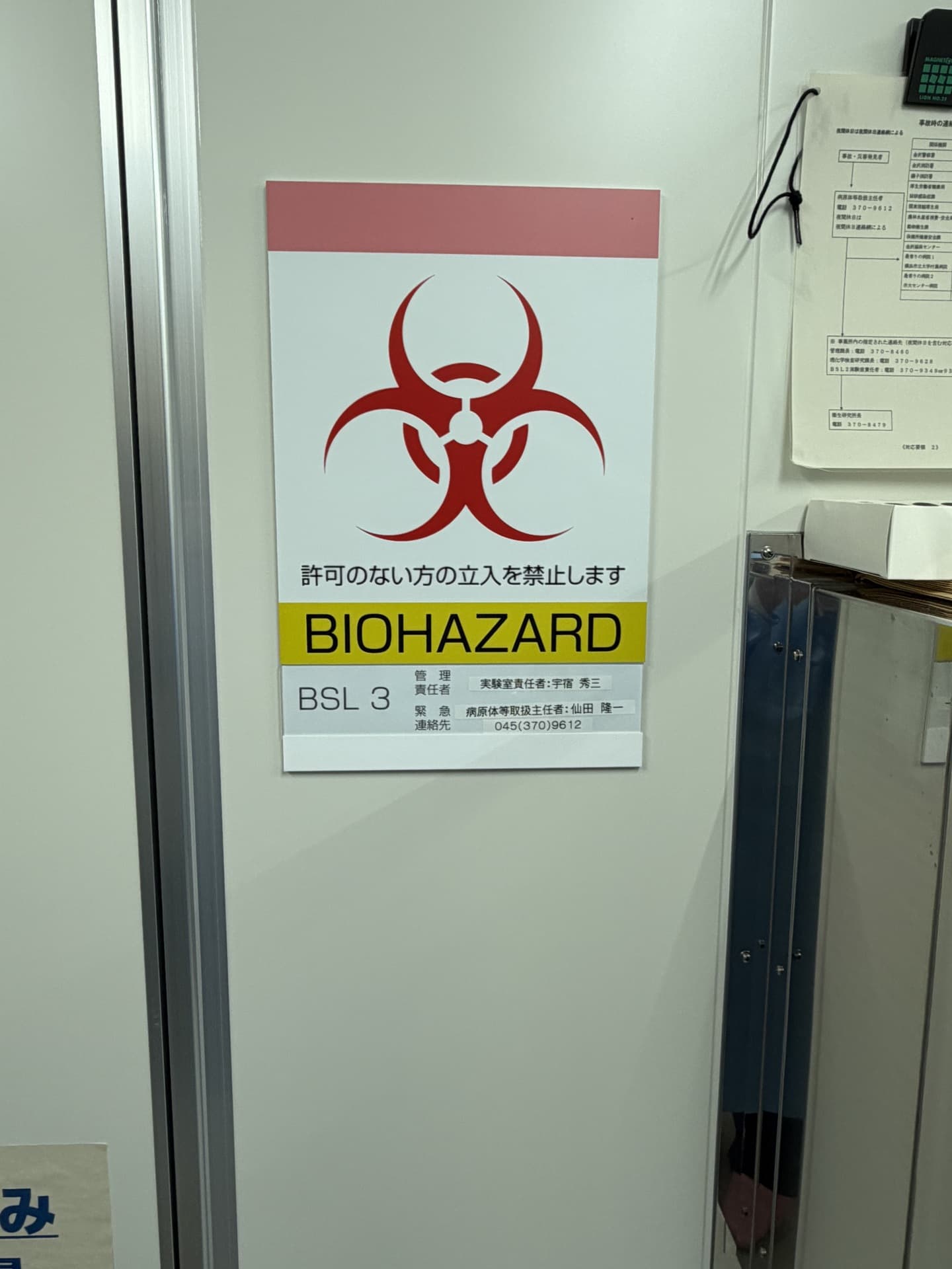 3階はウイルス・医動物エリアであり、Biosafety Level(BSL)3までの病原体(SARS、MERS、鳥インフルエンザ等)の取り扱いが可能とのことでした。